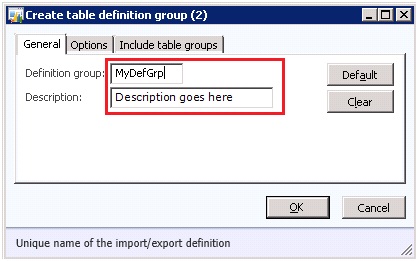 a) To create a definition group, open your AX client. Go to System Administration module->Common->Data export/import->Definition groups->Click on New button or Ctrl + N. On General tab of Create table definition group form, provide your Definition group and Description.