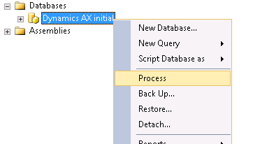 Start off with logging on to the Analysis Instance using SQL Server Management Studio. Find the “Dynamics AX initial” OLAP Database. If you have created multiple partitions, they will have their separate OLAP Database.Right click and choose Process to open the processing dialog: