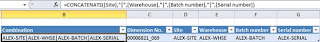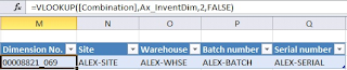 Combination field is simple concatenation of 4 strings {Site, Warehouse, Batch number, Serial number} with “” delimiter in the middle. This field will be used in VLOOKUP function during the import of Purchase Order lines in order to put correct InventDimId value in PurchLine.InventDimId field.